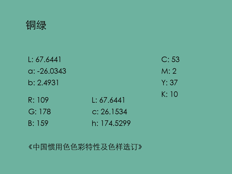 67.64 / -26.03 / 2.49 RGB: 109 / 178 / 159 CMYK: 53 / 2 / 37 / 10 HEX: #6DB29F |