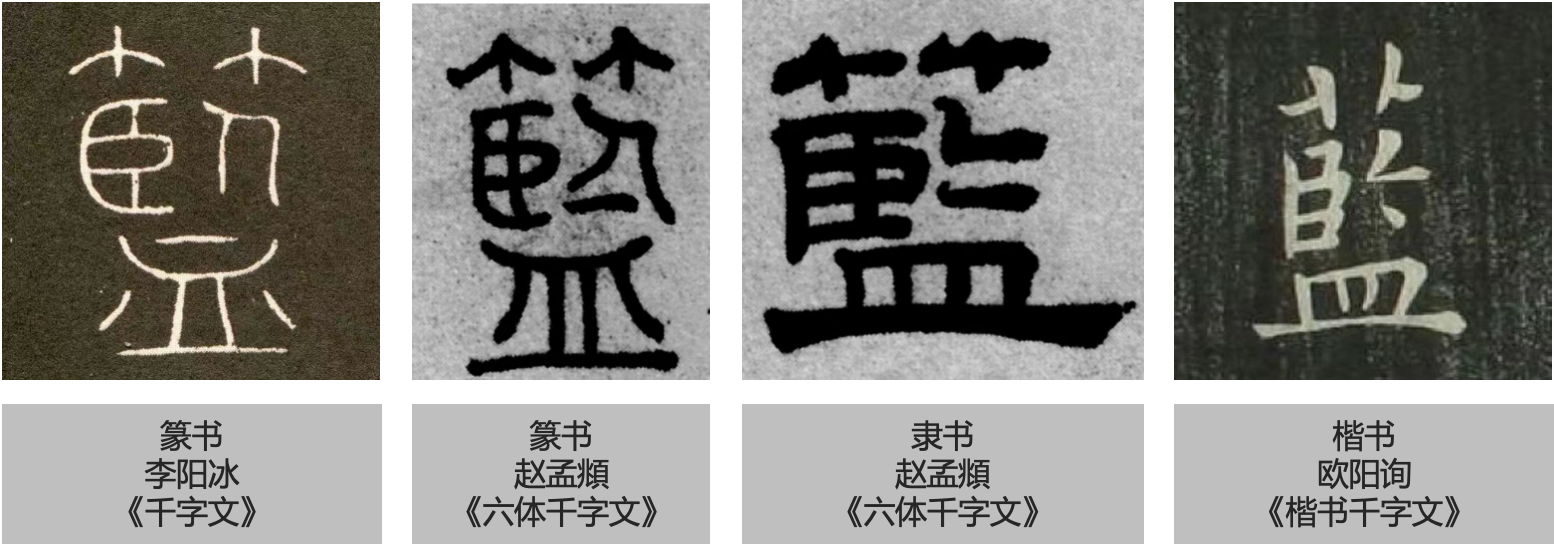 与“赤、白”相比,蓝字成形较晚(未发现甲骨文、金文的蓝字),用来表示颜色也较晚。“蓝”上面的“艹”表示与草木有关,即古汉语中“蓝”字最开始并不是用于描述颜色,而是表示“蓝草”的一种植物,“终朝采蓝,不盈一襜”。