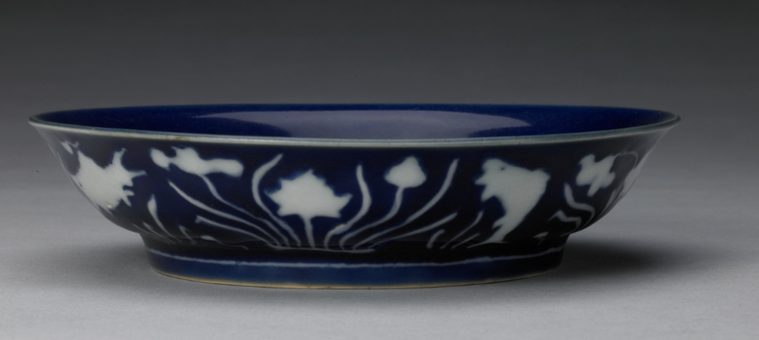▲ 明 宣德款祭蓝地白花鱼藻纹盘 北京故宫博物院藏