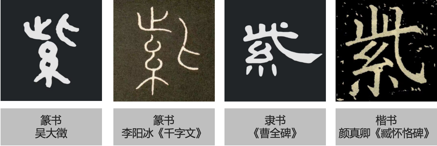 紫和红字一样,出现的年代稍晚,推测出现于金文或篆文的春秋战国时期。在《尔雅》中尚未出现紫字,西汉《急就篇》同时收录有红和紫字。紫字是由茈字借用來的,古文献中属于通用的,茈是和紫是同义,《山海经·西山经》中,就说明茈草就是染紫色的材料。