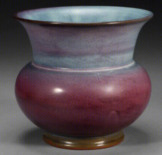玫瑰紫釉是宋代钧窑创烧的一种窑变釉。呈色绚丽多彩,斑驳瑰丽,红、蓝、青、紫相映成辉。