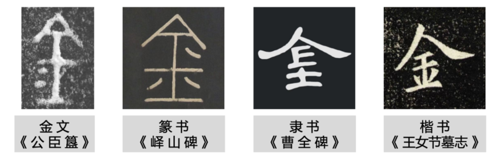 《说文·金部》:“金,五色金(金银铜铁铅)”。在金文中,字形左边两点像两块金属矿石,右边字形上半部为箭矢,下半部为斧钺。会可以用于制作箭头和斧头的金属之意。随着时间的推演,“金”慢慢从金属引申为“金属器物、钟鼎、货币、贵重、坚固”之意,并有了“金色”的色彩含义。